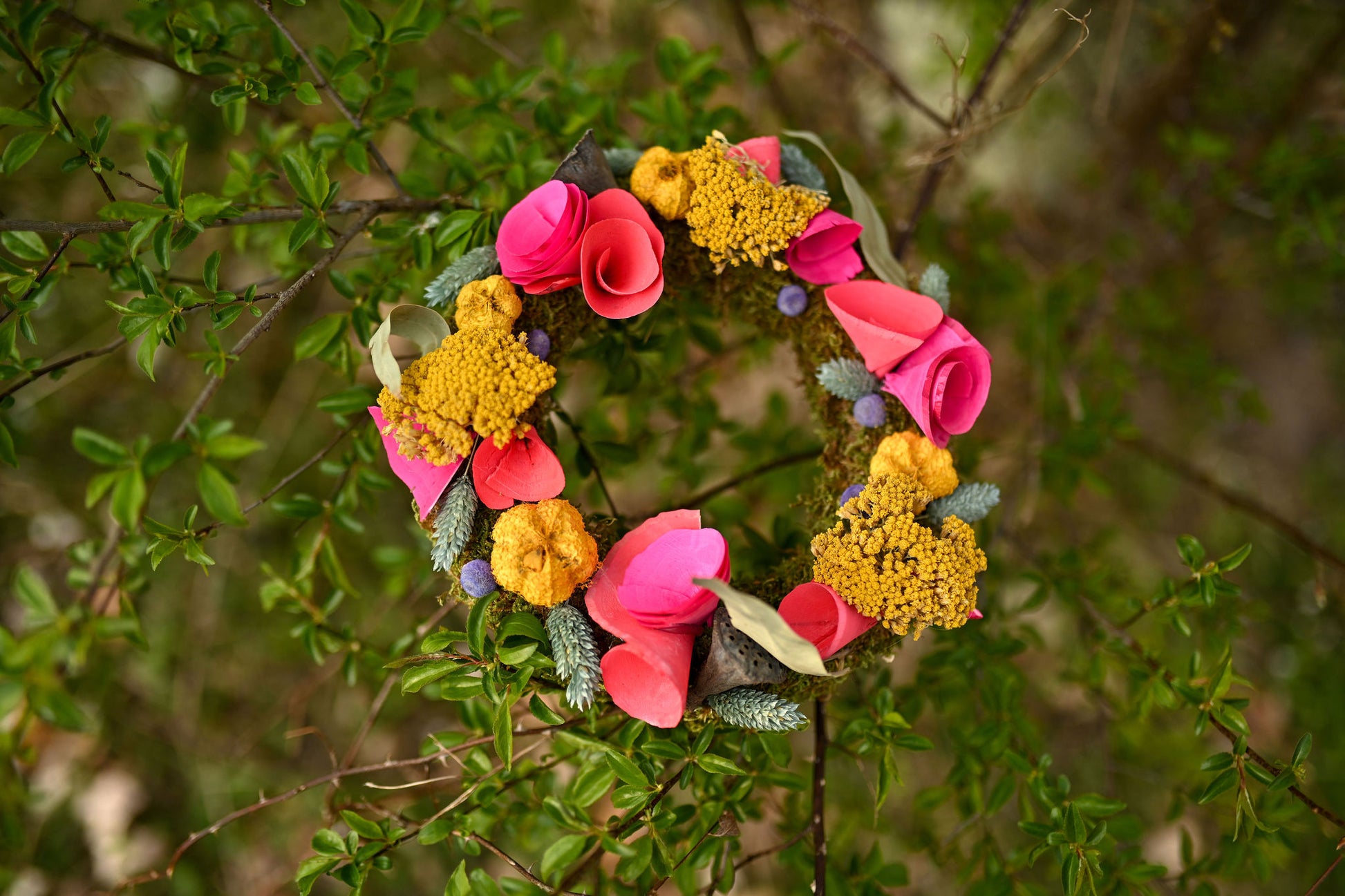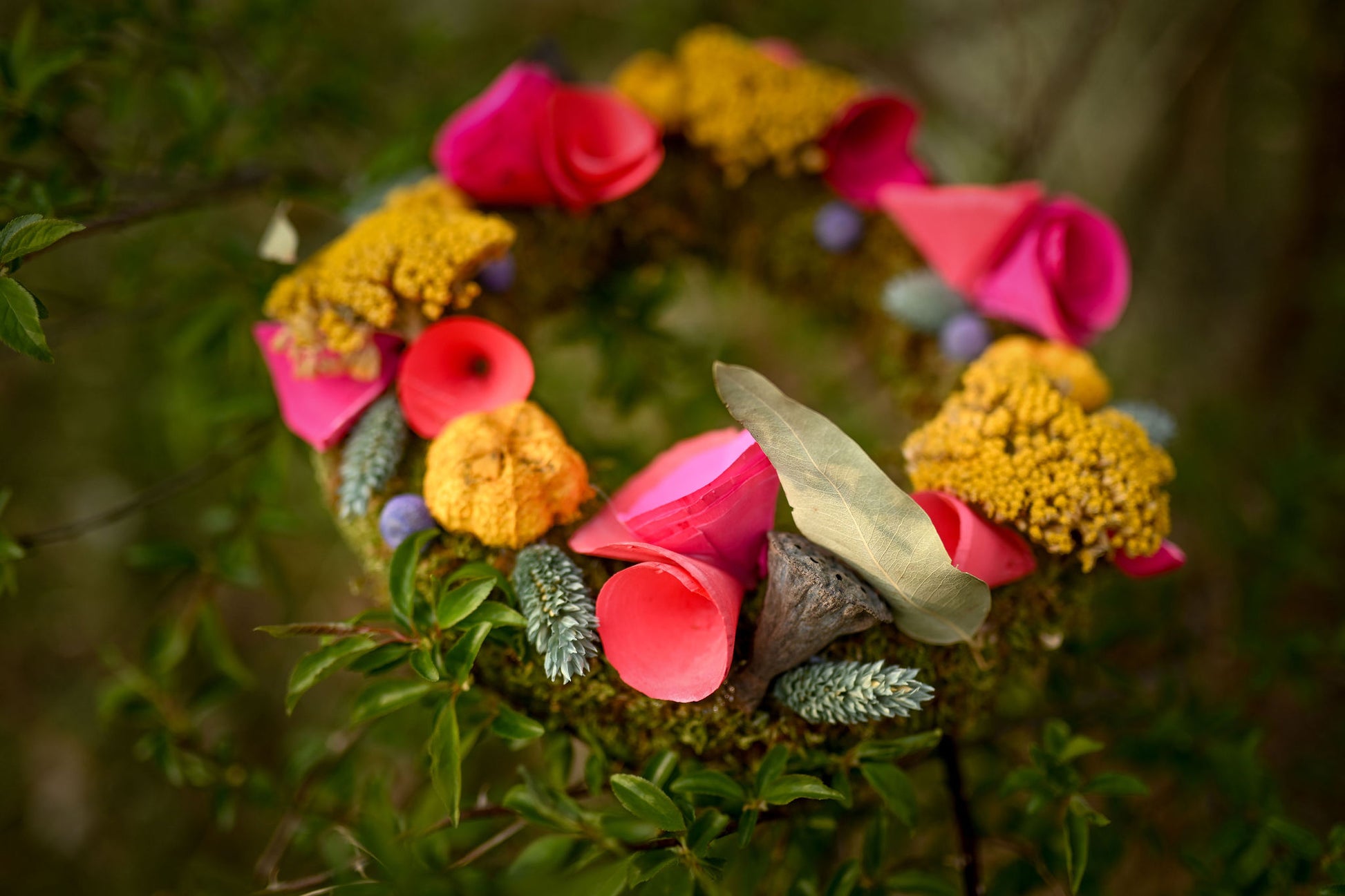 Coroniță din muschi natural si plante naturale uscate. Aduce stări de bine si bucurie. Ține mult timp.