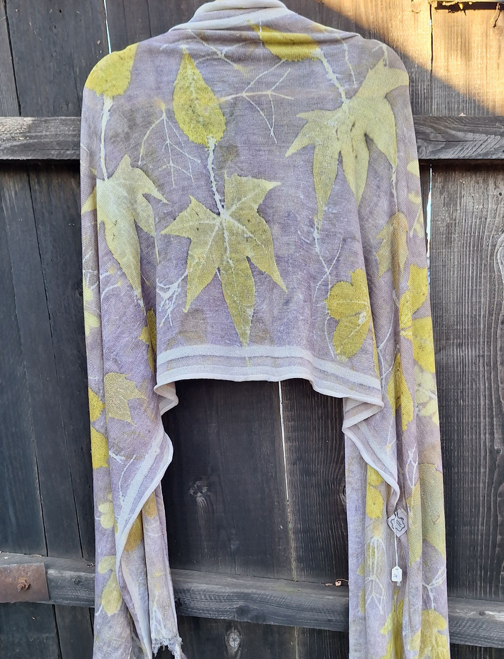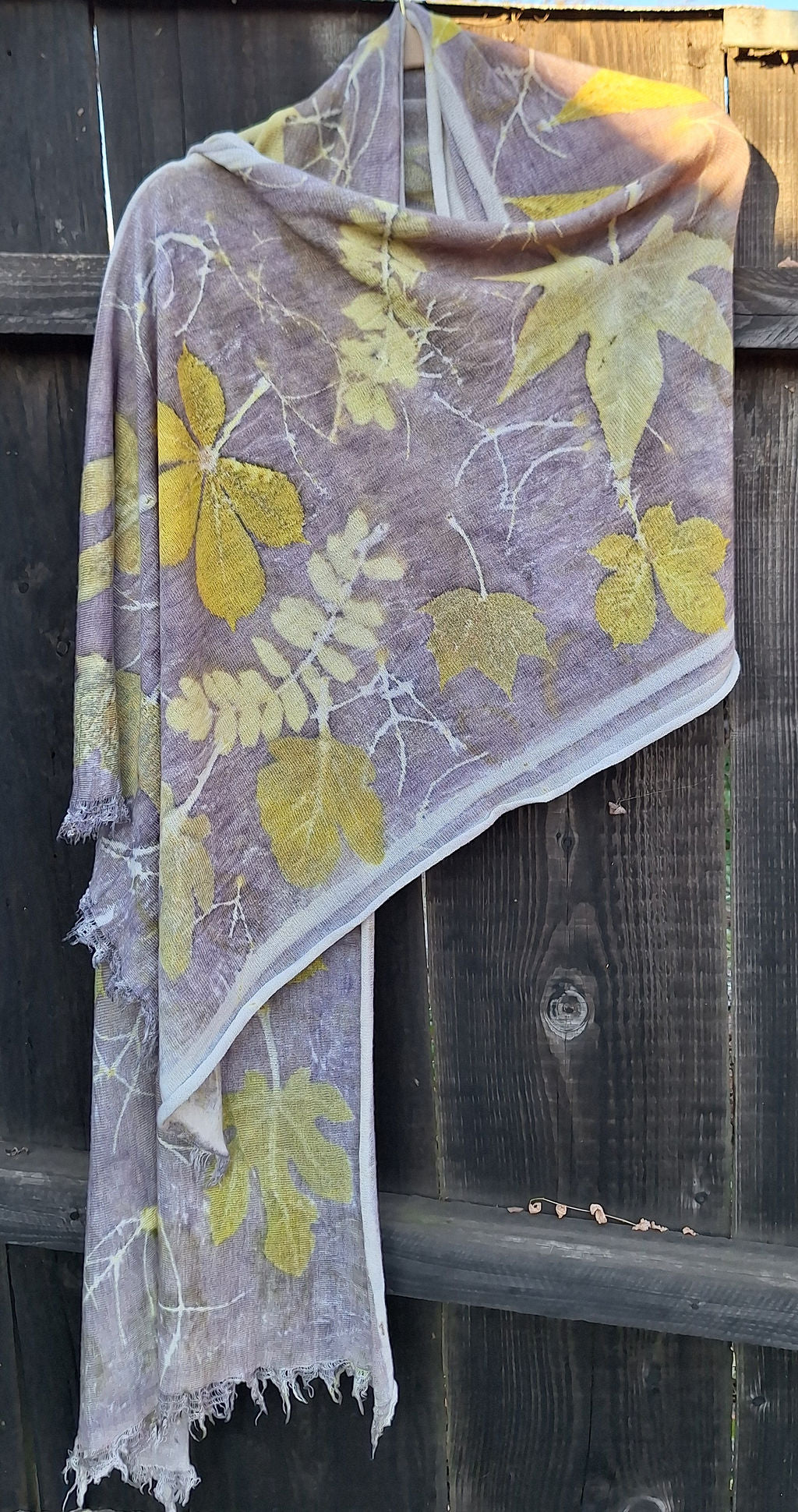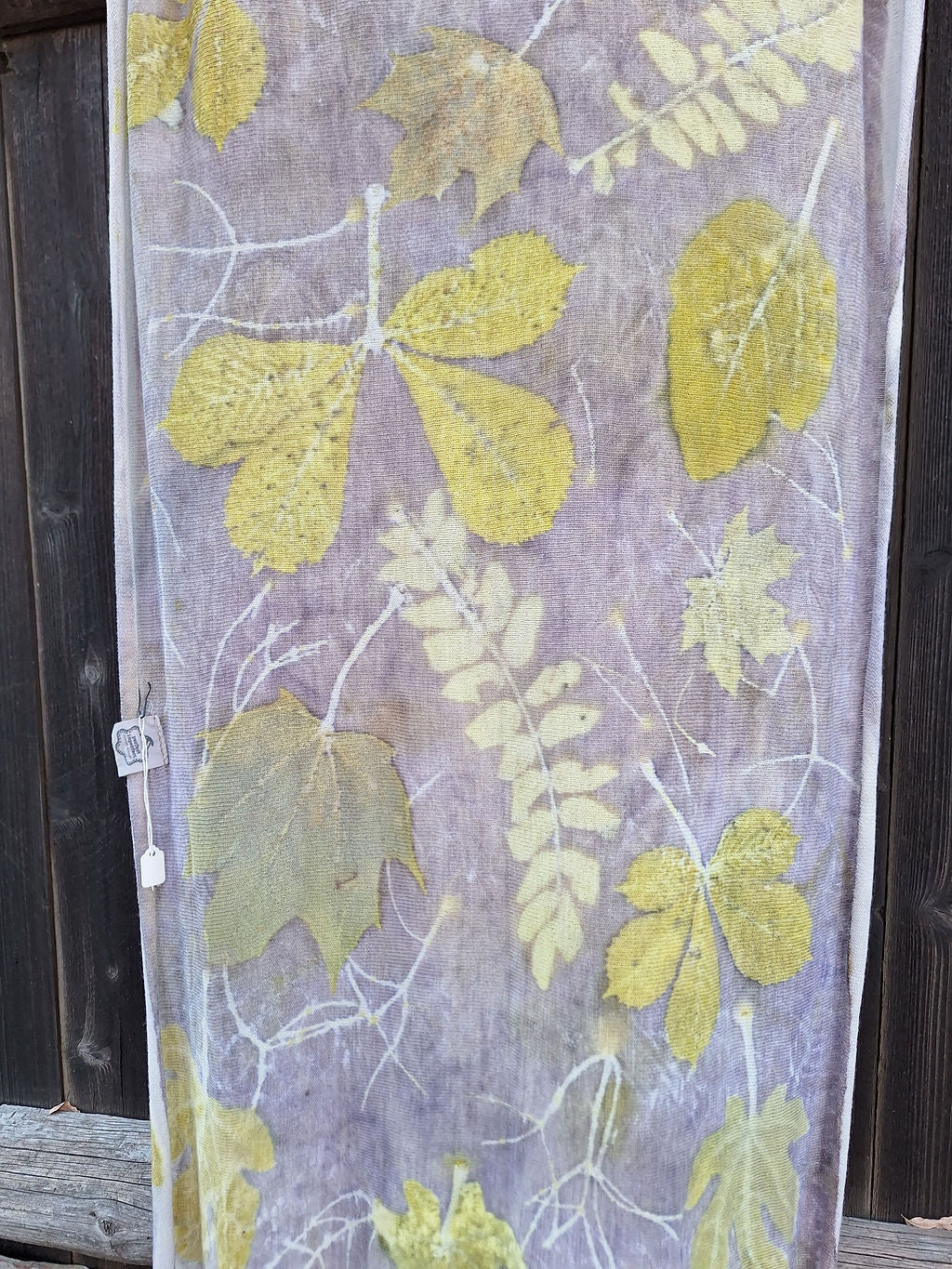 Irepetabilă. Imprimată manual cu frunze de smochin, castan, stejar, salcâm. Lână Merino 100%, ultra light, ultra fină.