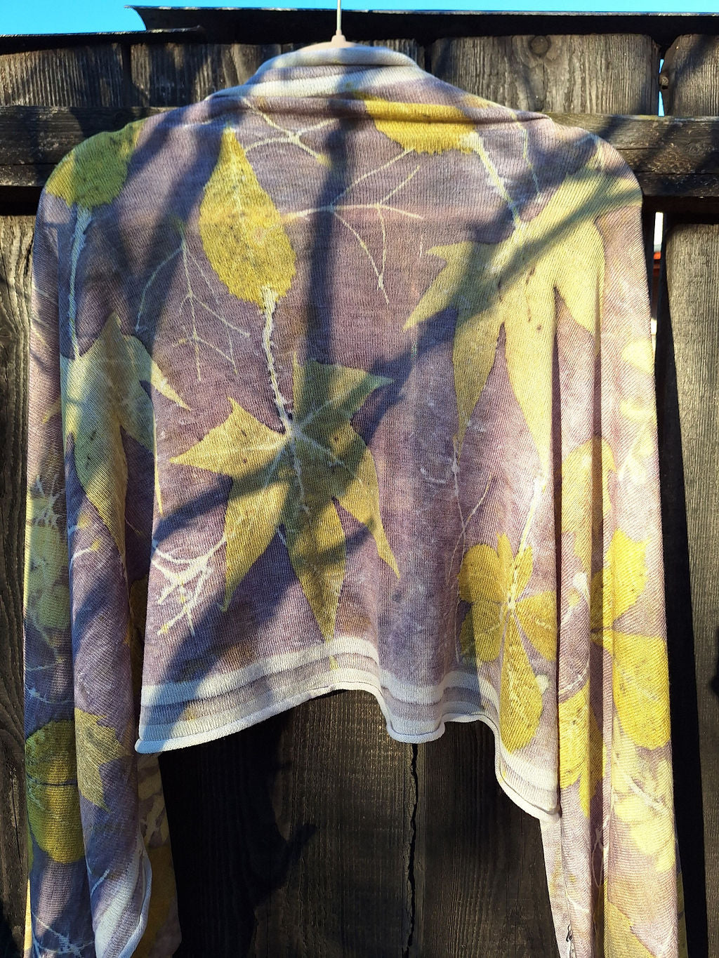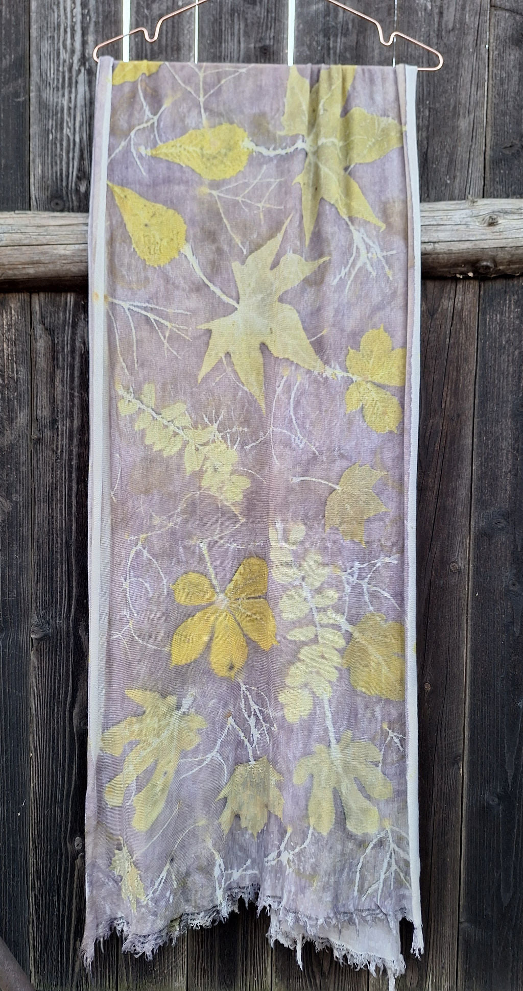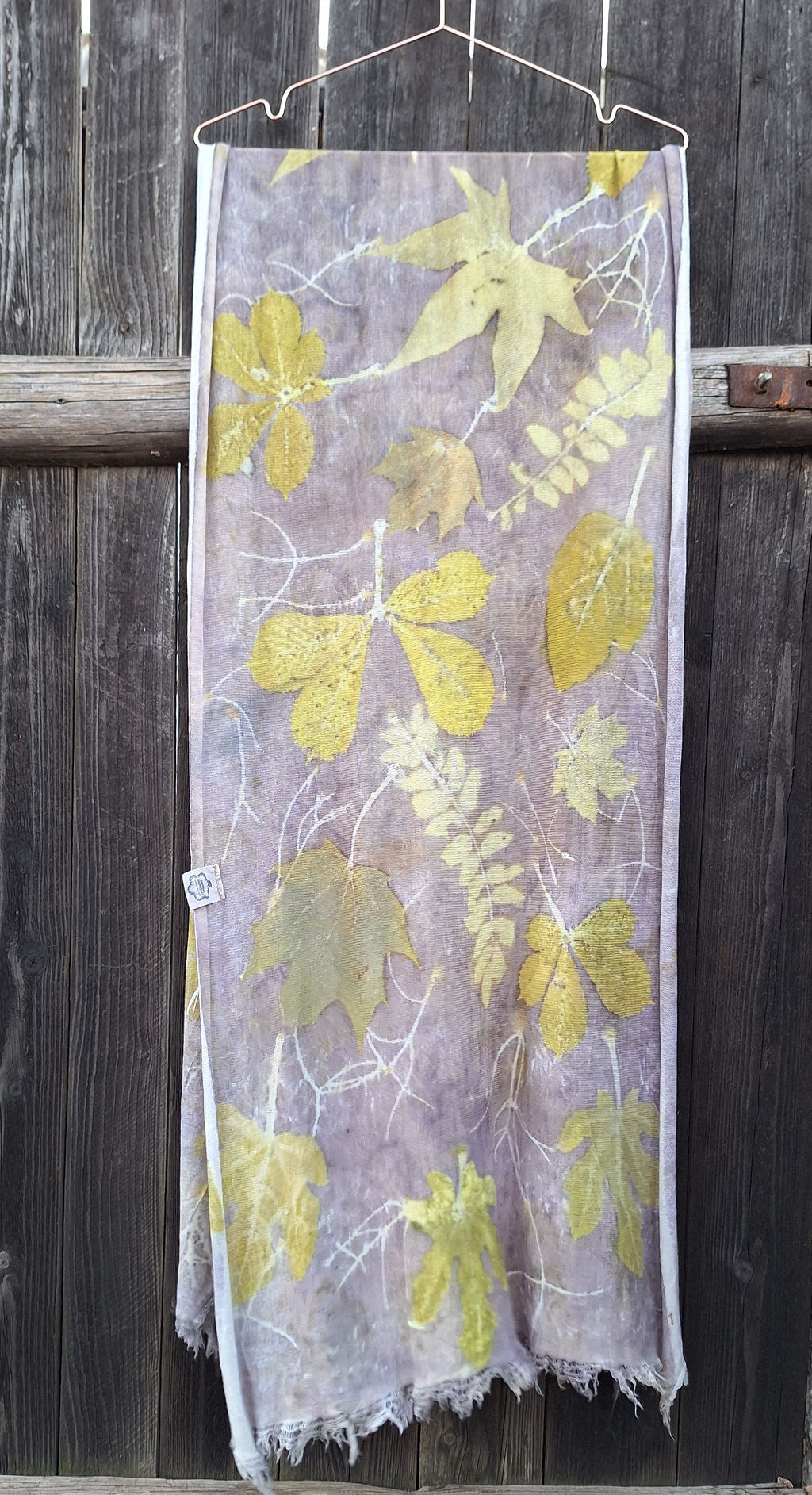 Irepetabilă. Imprimată manual cu frunze de smochin, castan, stejar, salcâm. Lână Merino 100%, ultra light, ultra fină.