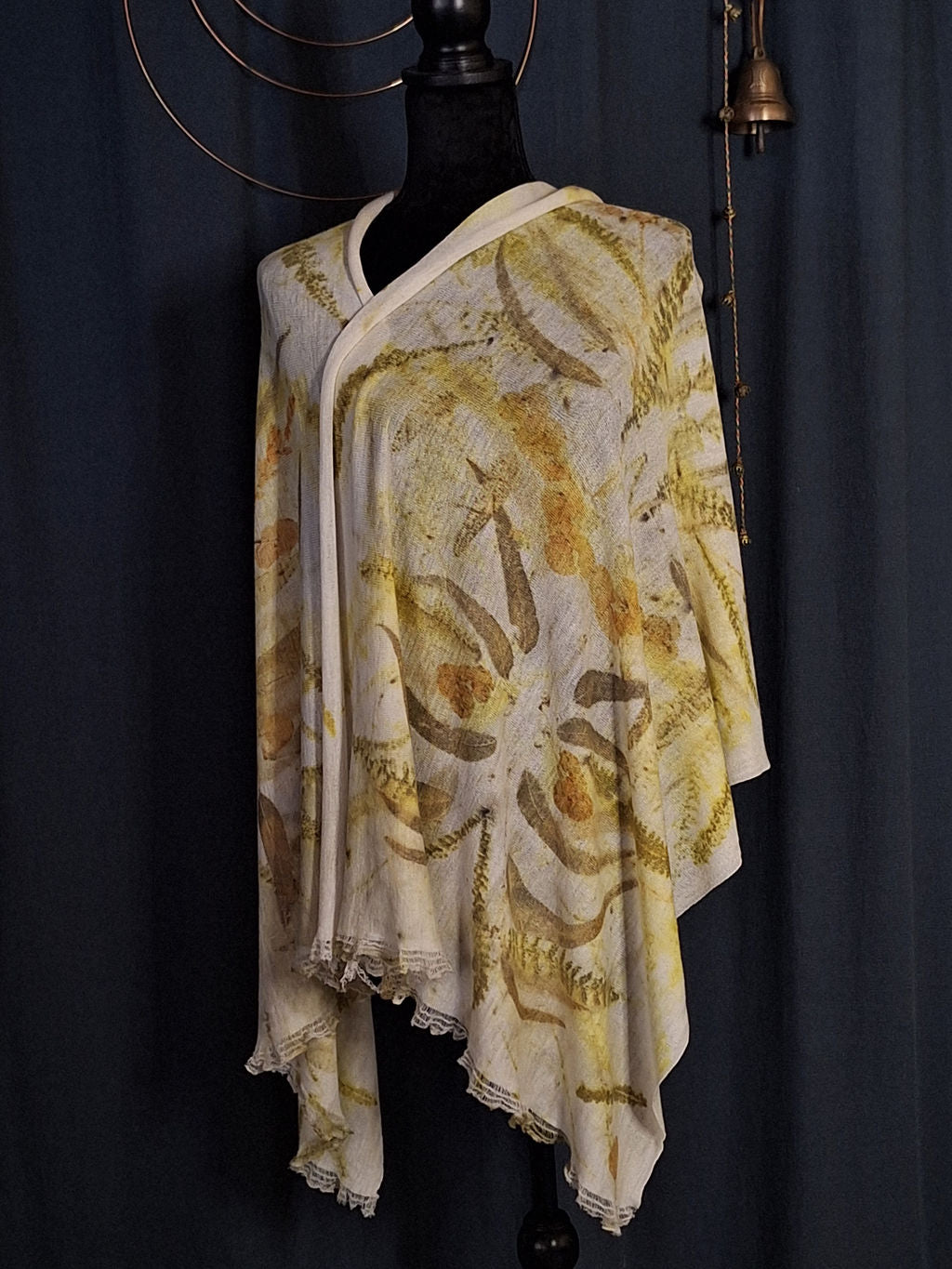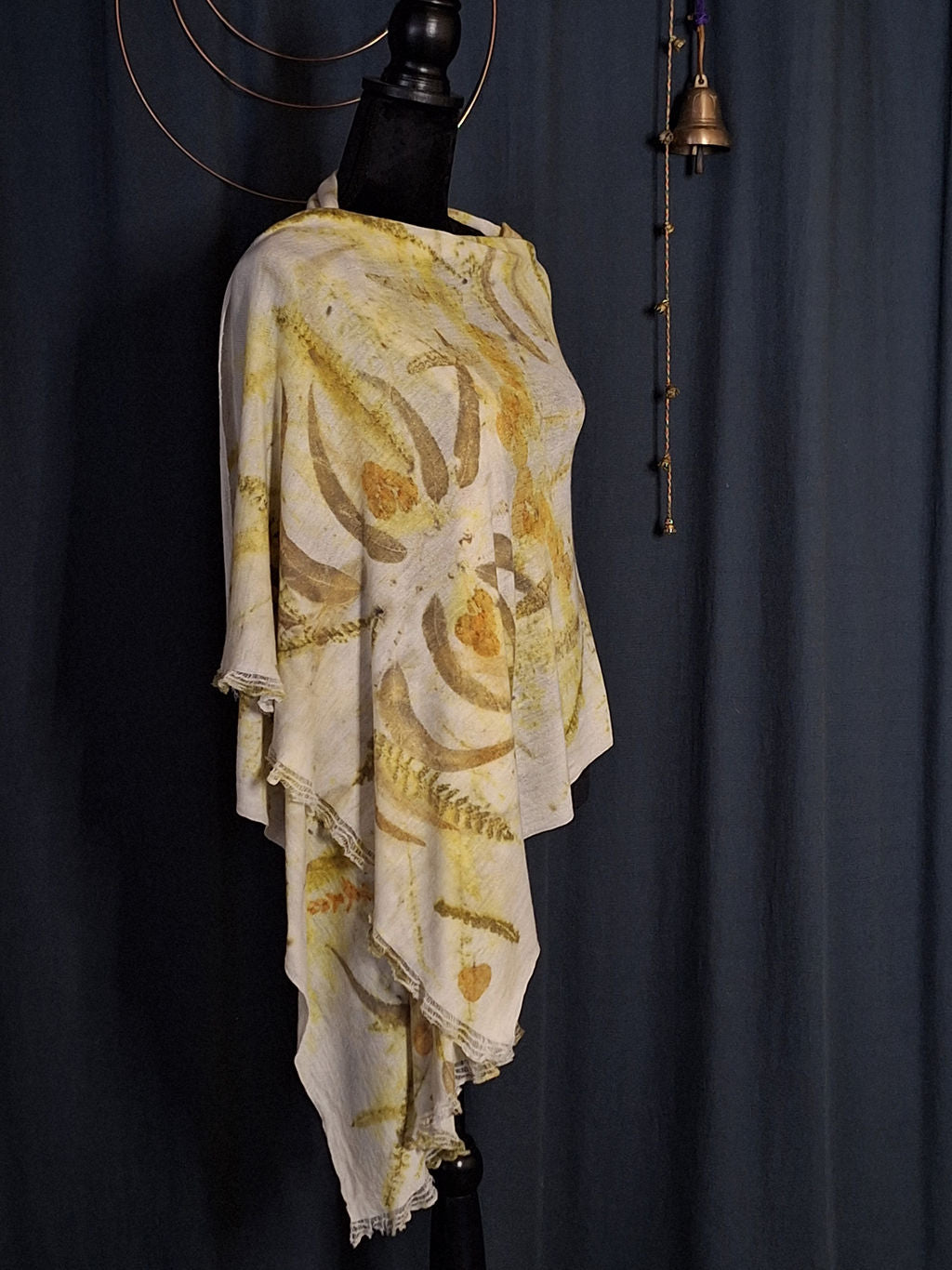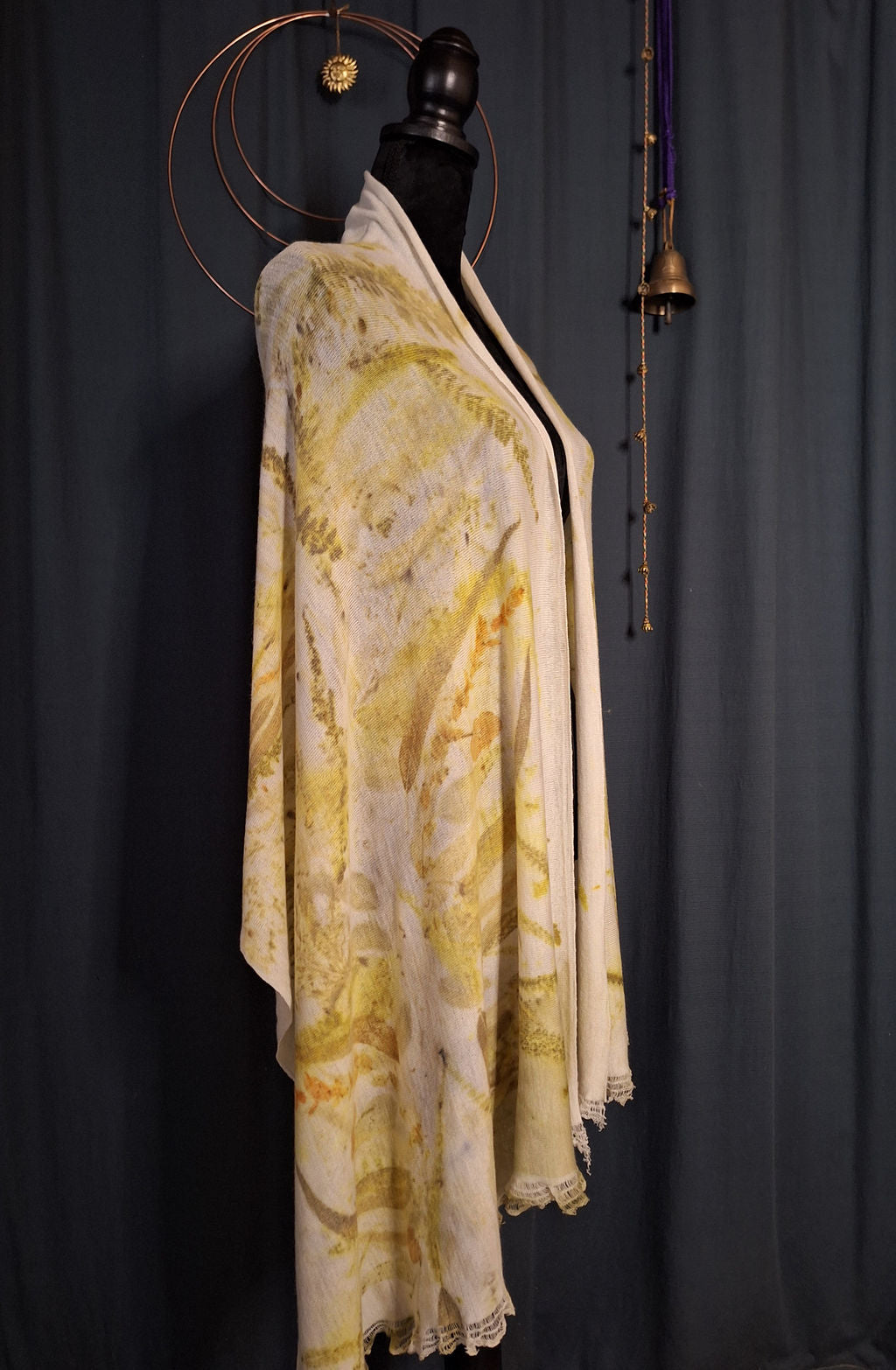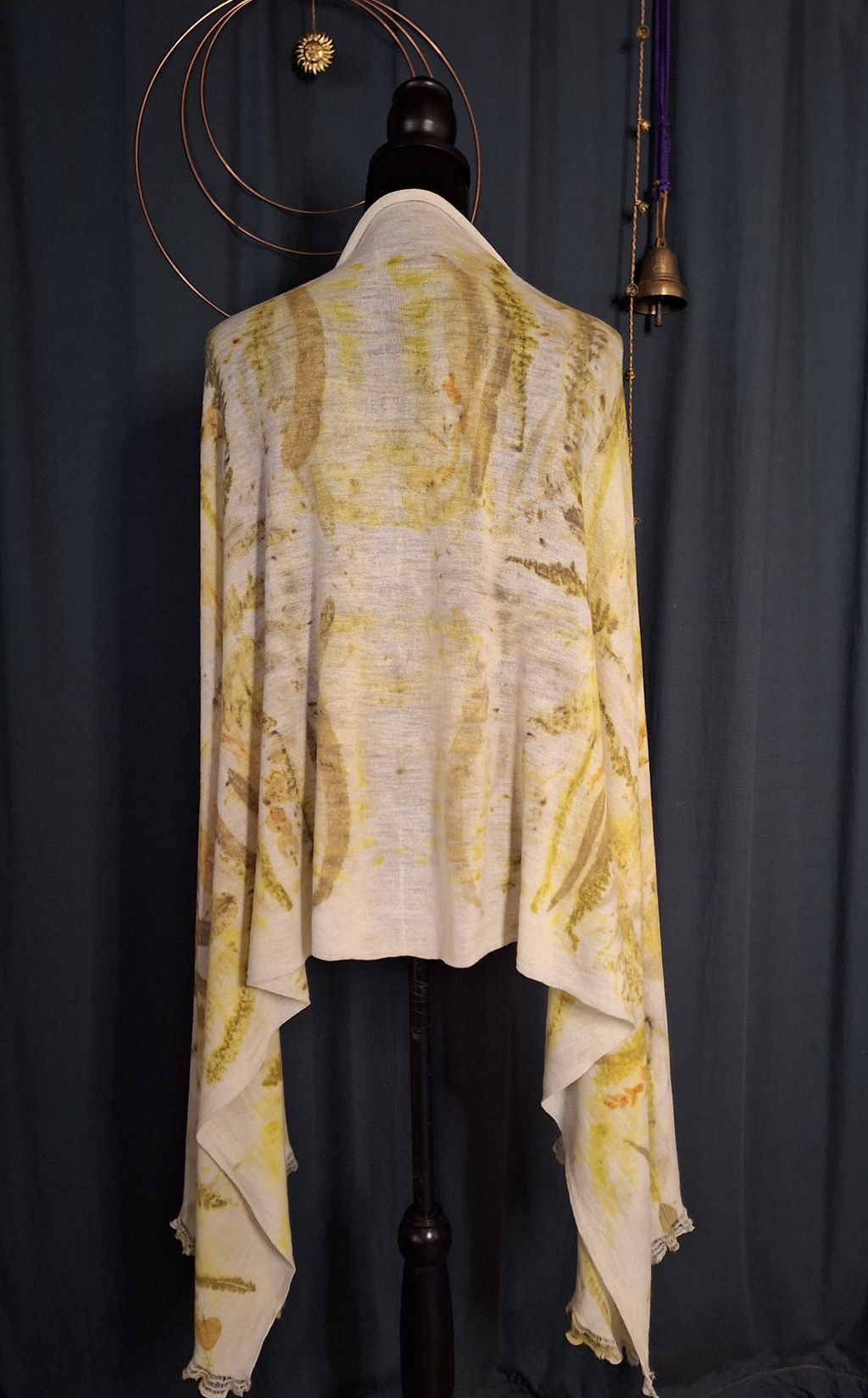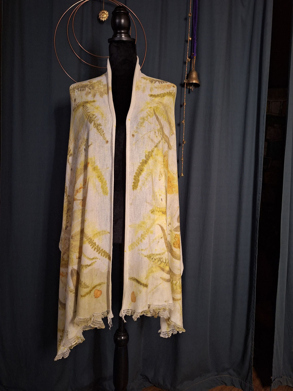 Irepetabilă. Imprimată manual cu frunze de smochin, nalbă și plante din fâneață. Lână Merino 100%, ultra light, ultra fină.