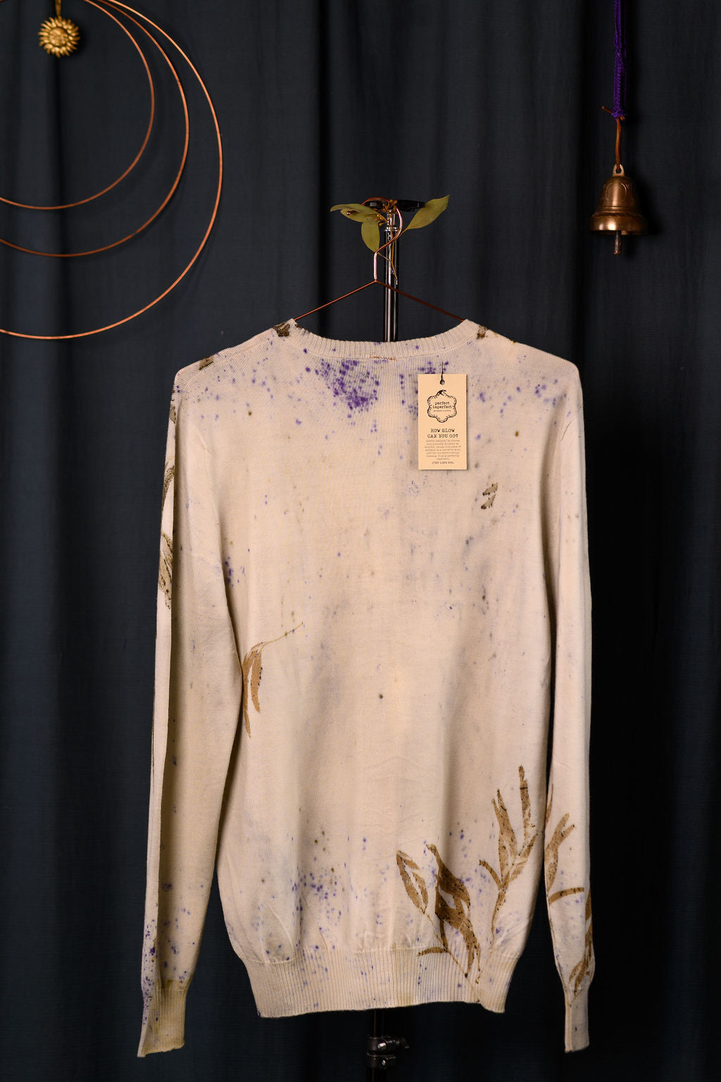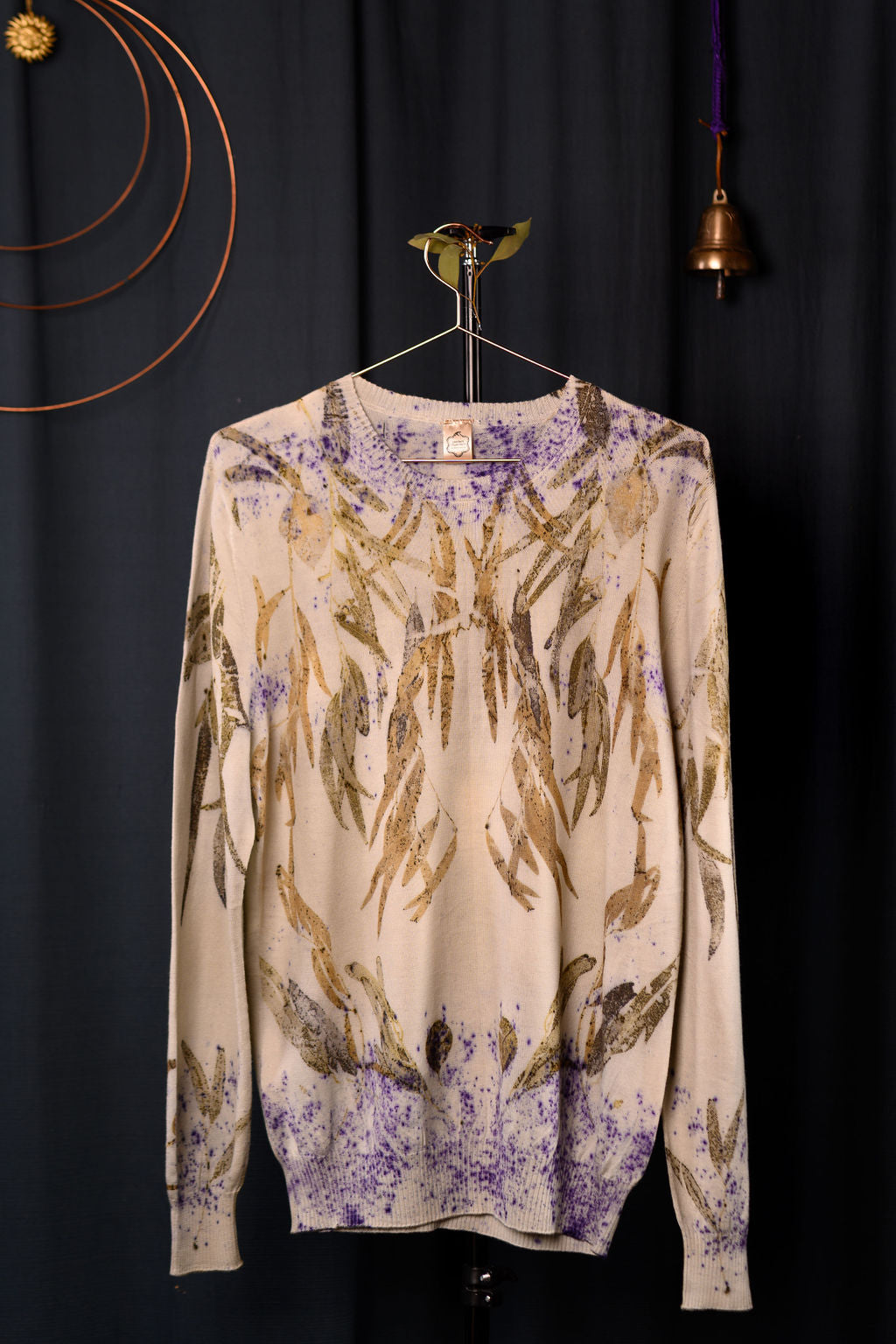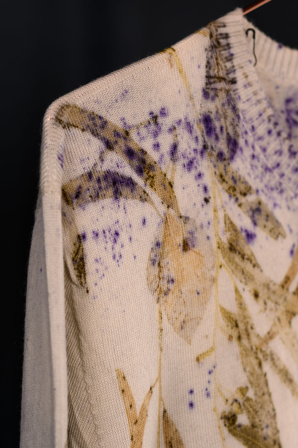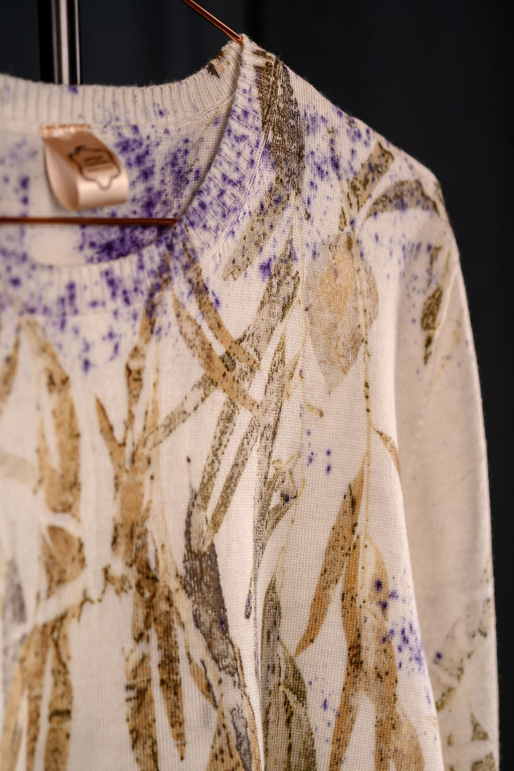 Unicat. Irepetabil. Este fin și moale, culori naturale, imprimat manual cu frunze de eucalipt. Imprimarea se menține și după spălare.