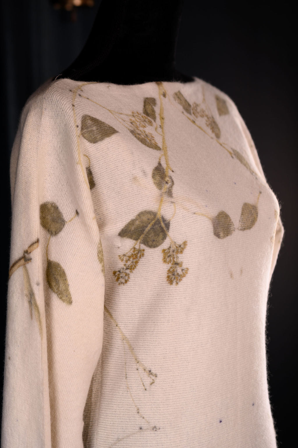 Unicată. Irepetabilă. Este fină și moale, culori naturale, imprimată manual cu frunze de eucalipt. Imprimarea se menține și după spălare.