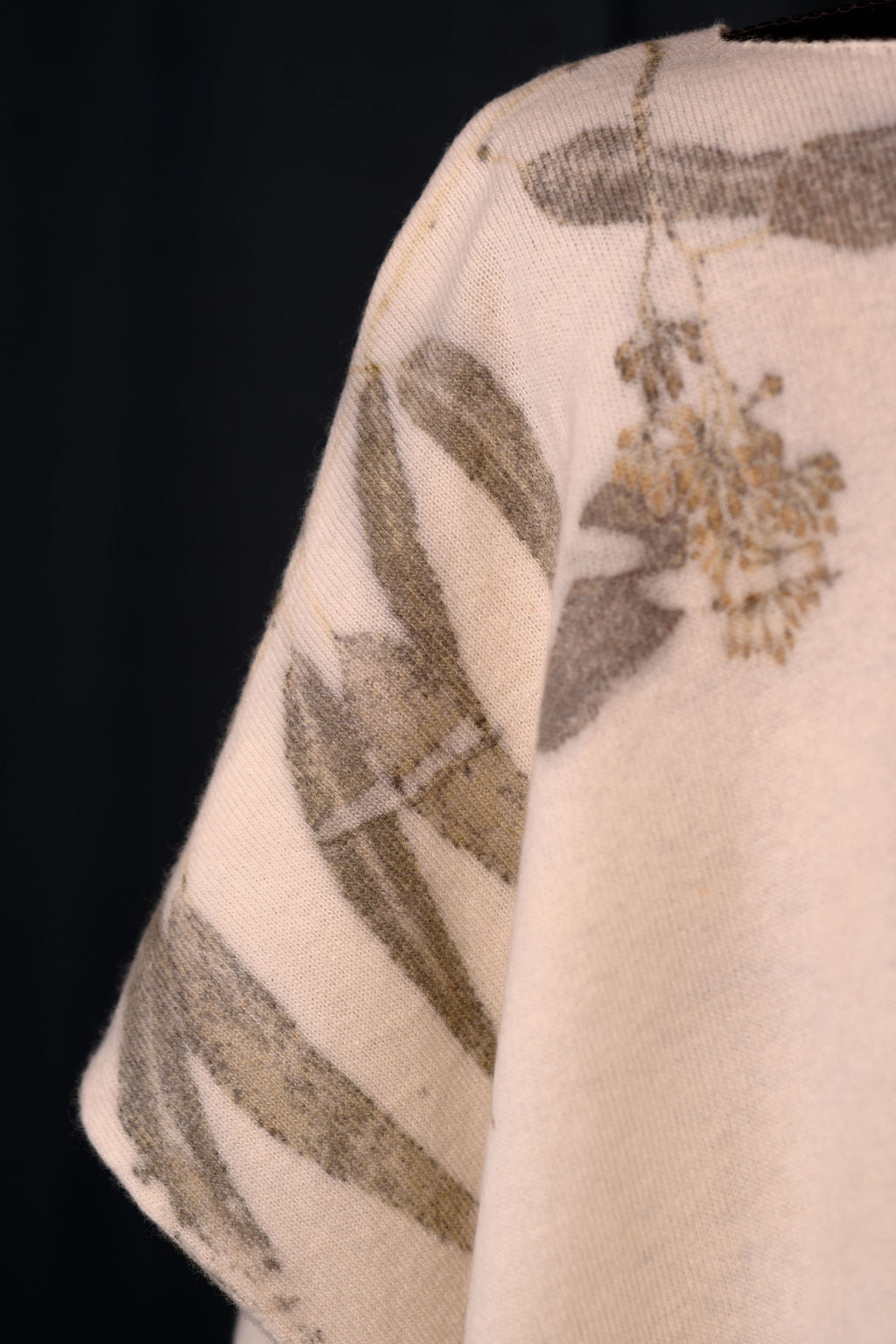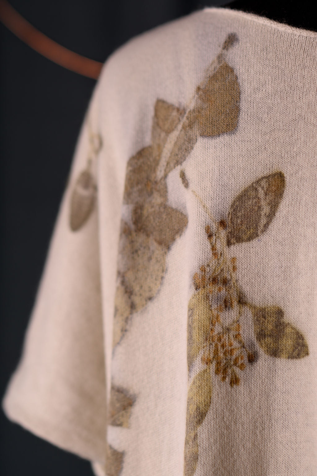 Unicată. Irepetabilă. Este fină și moale, culori naturale, imprimată manual cu frunze de eucalipt. Imprimarea se menține și după spălare.