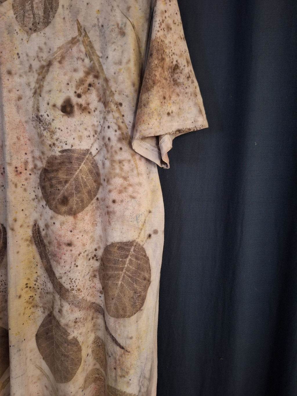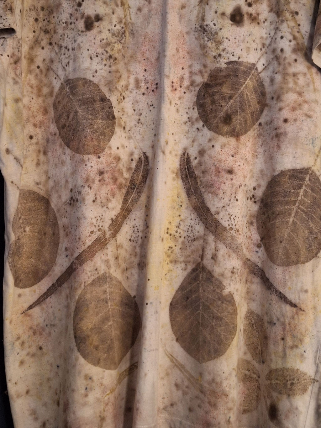 Irepetabil. Imprimat manual cu frunze de eucalipt, cotinus coggygria - scumpie, cornus sanguinea - sânger, condimente, ceai negru și rădăcină de copac.